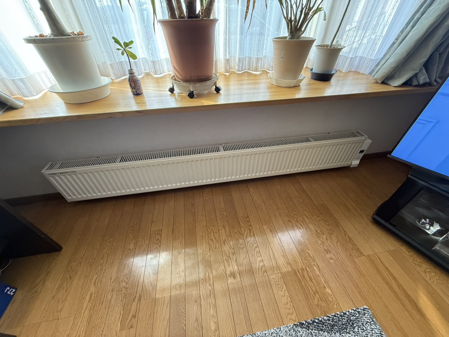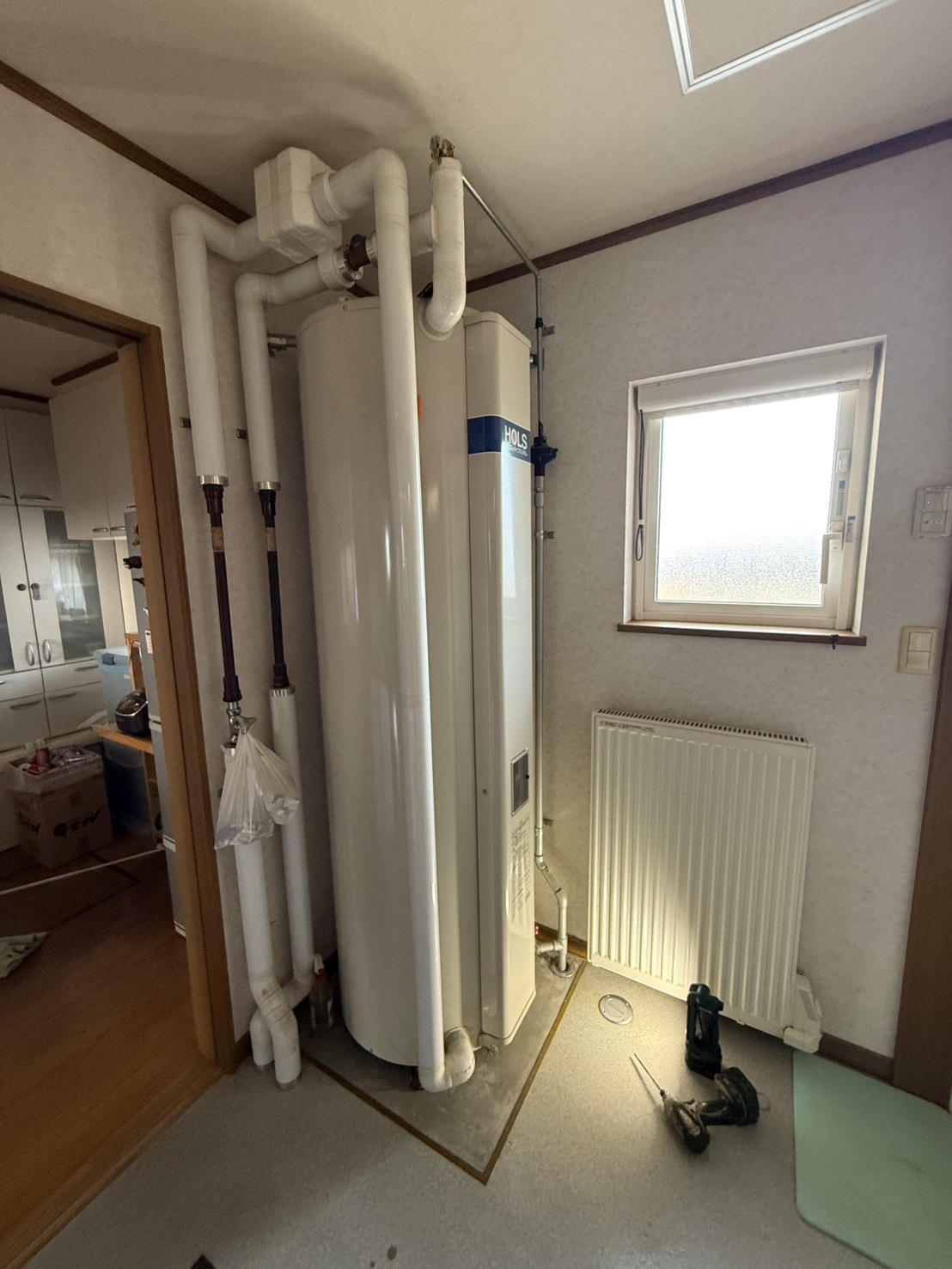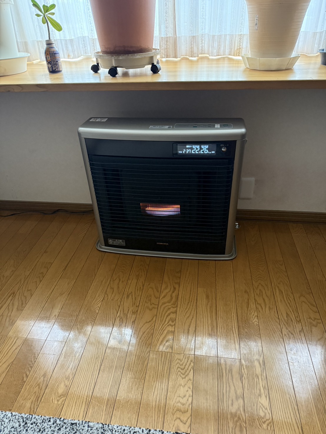 居間に設置されている電気オイルヒーターを薄型ストーブの「コロナFIRNEO」に交換し、電気温水器を撤去して壁掛け式の「長府直圧式給湯器」を設置させていただきました。