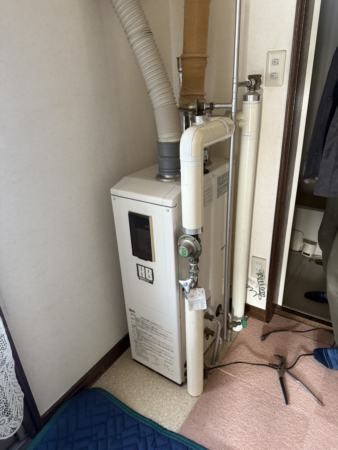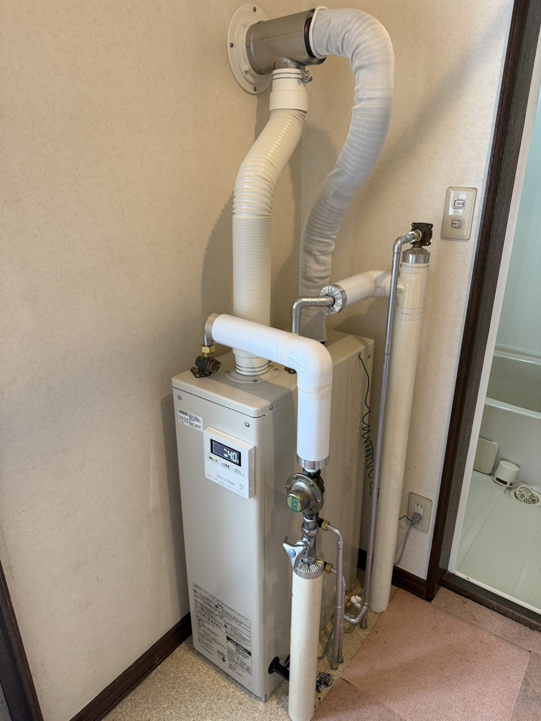 ノ-リツ製据置減圧給湯器から長府製据置減圧給湯器にお取替えさせていただきました。