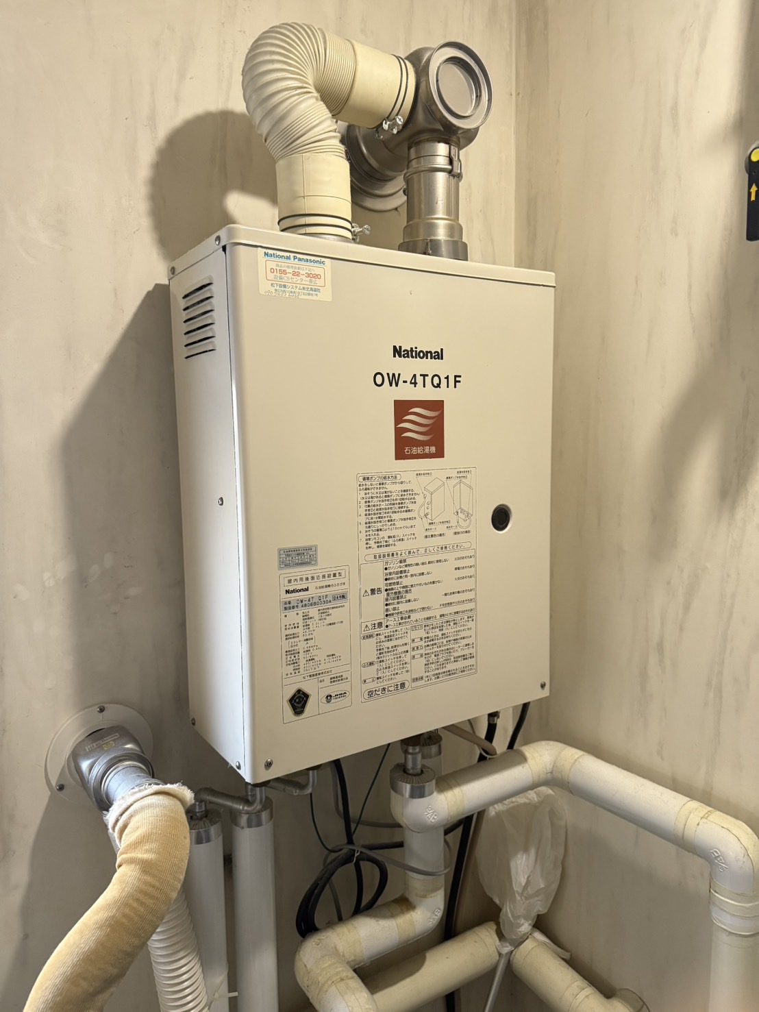 給排気トップの穴がナショナル製はセンター寄りになっている為、下に設置されている暖房機の給排気トップに干渉しない様、向かって右壁面寄りに設置させていただきました。