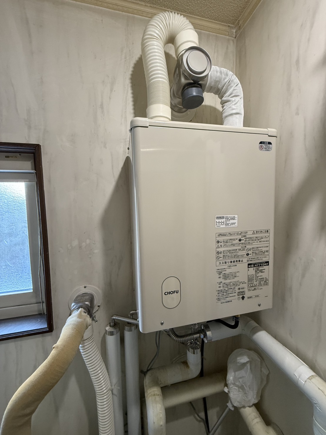 ナショナル製壁掛け給湯器から長府製壁掛け給湯器に交換作業をさせていただきました。