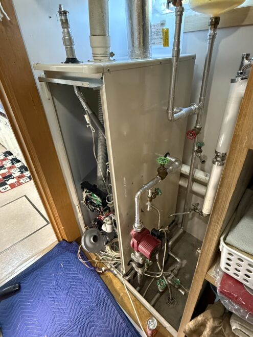 既存ボイラの缶体容量は60Lと大容量のため、本来であれば内部で漏れがあれば外部に相当量が流れ出てきてもおかしくありません。しかし、今回は漏れ箇所が缶体上部付近と推測され、一定量が漏れた時点でそれ以上は外部に出ず、内部で留まってしまう状態になっていたと考えられます。