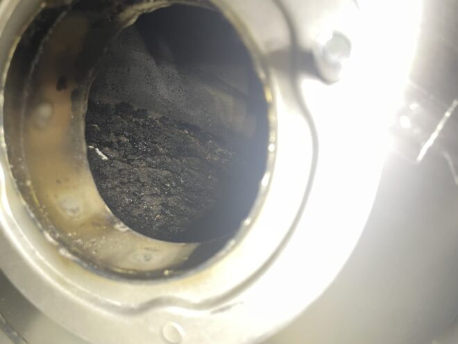 漏れた不凍液は燃焼室の高温により蒸発してしまうため、外部にはほとんど痕跡が残らず、結果として写真のような残留物のみが確認される形となりました。