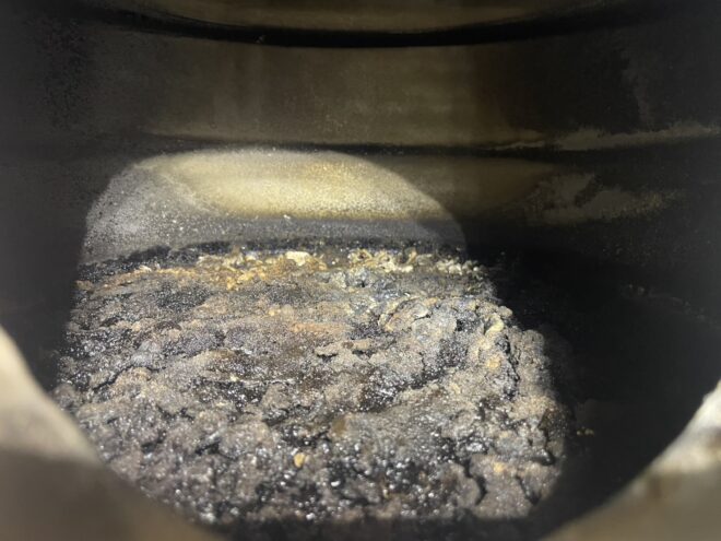 ボイラ周りや中和器にも漏れは確認できず不思議な状況でしたが、バーナーを外して缶体内部を確認したところ、内部で不凍液が漏れている痕跡を発見いたしました。
